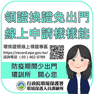 ※ 環保專責及技術人員訓練將視嚴重特殊傳染性肺炎(COVID-19,簡稱新冠肺炎)疫情異動,實際開班日期請至本所開班資訊網頁查詢或逕洽各班期聯絡人。