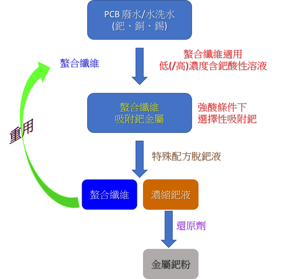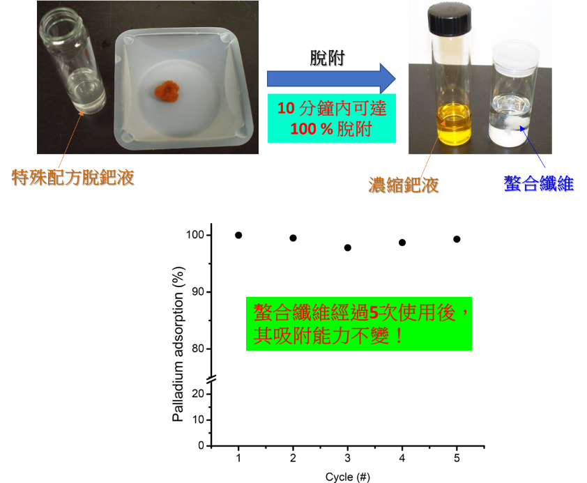 針對貴金屬鈀元素之回收,偕胺肟羧酸鹽雙官能基螯合纖維技術具有優異的再生能力。通過開發的溫和洗脫工藝,吸附的金屬離子可在室溫下高效移除,纖維結構保持穩定並可多次循環使用,降低了運行成本並符合綠色化學理念。