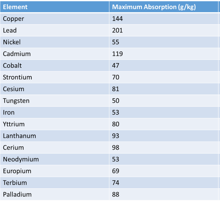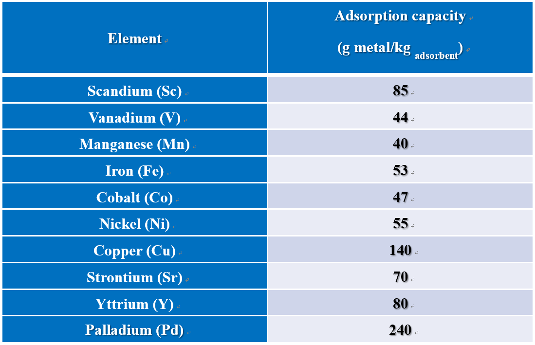 表1、偕胺肟羧酸鹽雙官能基螯合纖維在真實海水中各種金屬元素的分佈係數(Distribution Coefficient)