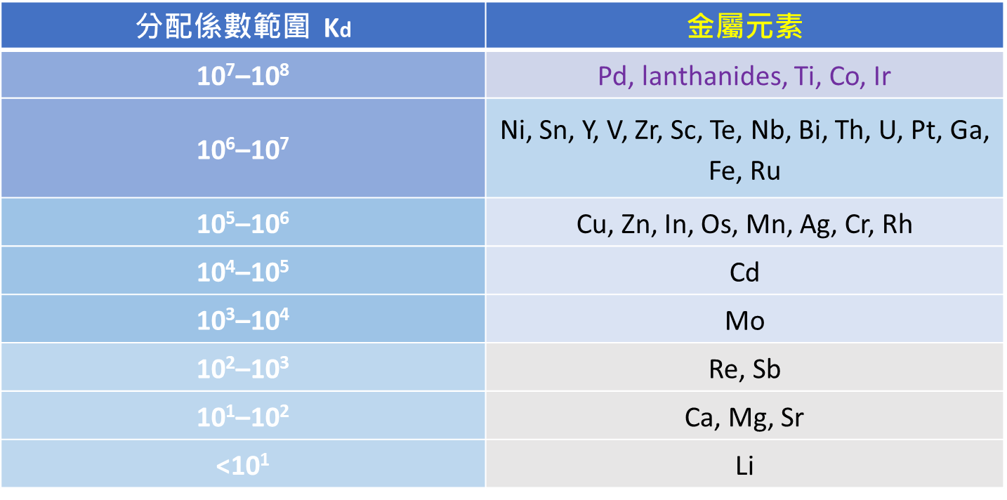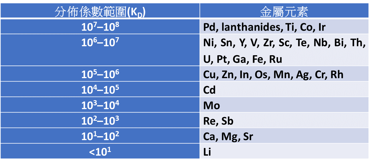 表4、各種金屬元素與偕胺肟羧酸雙官能基螯合吸附纖維上的分配係數範圍表