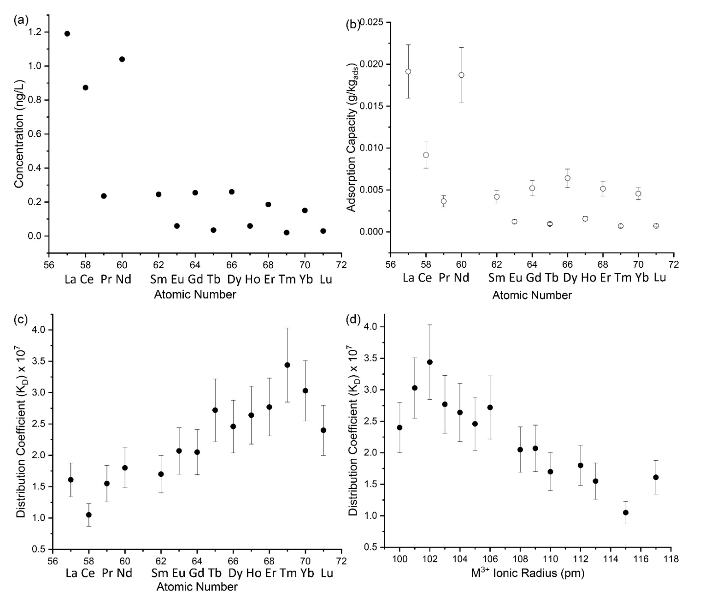 除了鈾之外,偕胺肟羧酸雙官能基螯合纖維對稀土元(REEs)同樣表現出優異的吸附能力。Pan等人的實驗證明,透過56天海水暴露實驗和ICP-MS分析,該纖維能有效吸附海水中的鑭系元素,所有萃取鑭系元素的分配係數(KD值)按原子序數增加順序呈現線性關(R² = 0.79),其中釹元素的KD值達(1.80 ± 0.31) × 10⁷,約比鈾高一個數量級,且對重稀土元素的吸附能力優於輕稀土元素,這與三價鑭系元素在海水中的吸附程度與鑭系離子電荷密度呈正相關的螯合機制理論相符,重鑭系元素因鑭系收縮效應具有更高的電荷密度,導致與偕胺肟基團形成更強的結合。此技術為從海洋中獲取這些廣泛應用於高科技產業的關鍵原料開闢了新的道路,特別是海洋中稀土元素總量豐富,且海水淡化廠產生的高礦物濃度鹽水為這種環境友好的採礦替代方案增添了特殊的經濟吸引力。
