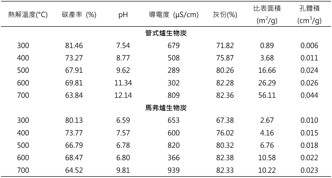 表1、兩種熱解爐製備之生物炭基本特性及比表面積