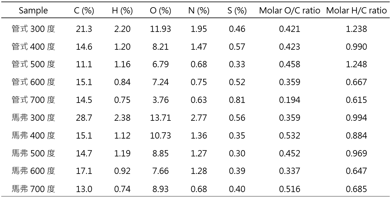 表2、兩種熱解爐製備生物炭之元素組成與莫耳比分析