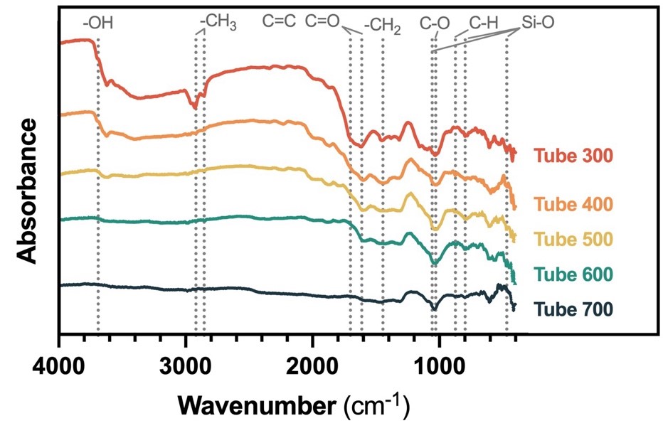 圖1、管式爐於不同熱解溫度下製備之生物炭表面官能團