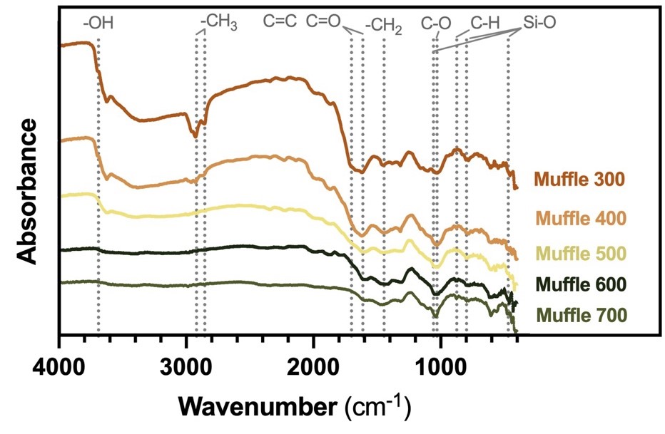 圖2、馬弗爐於不同熱解溫度下製備之生物炭表面官能團