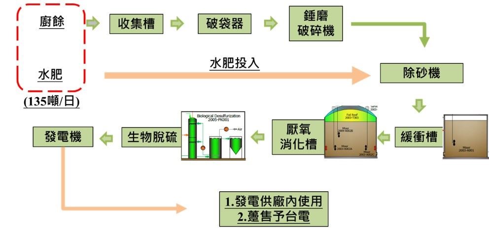 台灣的生質能中心的厭氧消化處理程序,透過控制反應溫度、pH 值及碳氮比,以提高甲烷的產率。將其產生的甲烷作為燃料,驅動鍋爐與汽輪機進行發電,所產生的電力併入電網。
