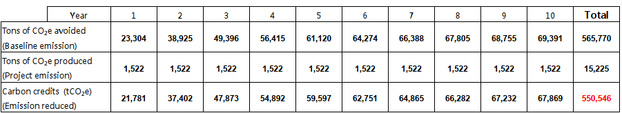 電力使用133.28MWh/年,液化石油氣使用7.933噸/年電力排放係數:0.622 kgCO₂e/kwh ;液化石油氣排放系數以2.98 tCO₂e/噸計算(IPCC)TTT酵素處理專案排放量計算結果,顯示於表4.的第2欄