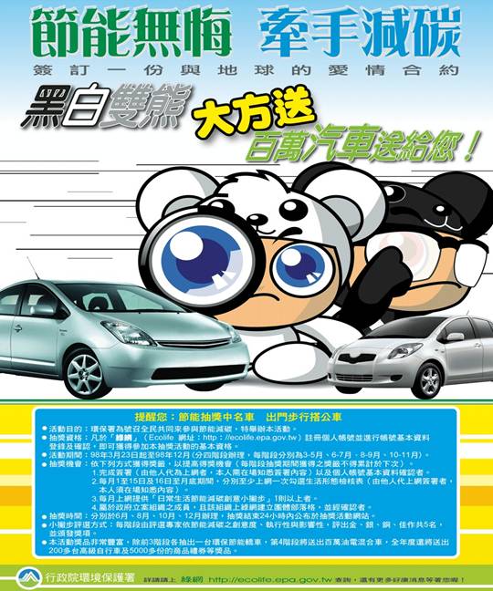 為推動節能減碳,環保署號召全民從生活中一起力行,並自即日起至98年12 月舉辦「節能無悔 牽手減碳」。 本活動參加抽獎人請於『綠網』(Ecolife網址 :http://ecolife.epa.gov.tw)註冊,即可獲得參加本抽獎活動的基本資格,最大獎項為環保節能轎車及油電混合車,抽獎時間分別於6月、8月、10月、12月辦理,詳細抽獎內容請逕上綠網查詢或活動海報。(溫減管理室)