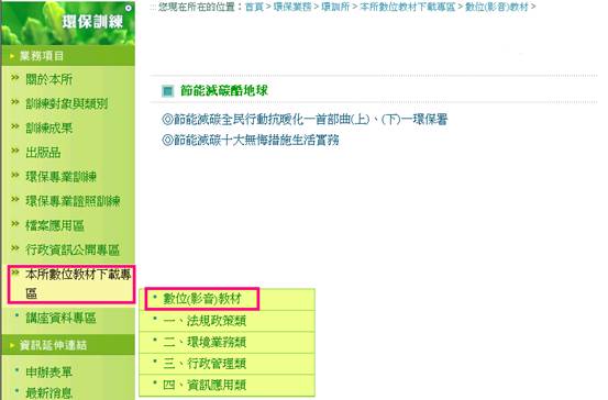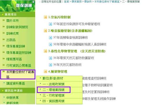 因應網路蓬勃發展,為服務廣大學員及對環保有興趣之社會大眾,環訓所於環保署網站(http://www.epa.gov.tw)「環保訓練」項下建置「數位教材下載專區」,持續不斷充實內容並提供近3年經授課講座授權之環保專業訓練教材電子檔,類別包含「法規政策」、「環保業務」、「行政管理」及「污染管制系統資訊應用」等4大類70餘門訓練講義教材(PDF電子檔),並掛載生活環保實務課程影片如節能減碳等,提供政府機關、事業機構、學校及有興趣民眾上網學習,以期將有限資源發揮最大效益,讓環保訓練更多元活潑,服務更多的有興趣的人士。