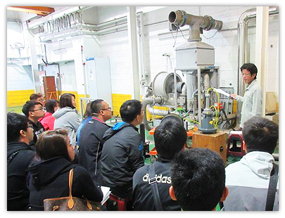 術科課程,因人數眾多,因此採取分組教學的方式進行。講師在車輛中心的測試室,以實際的底盤動力計、定容取樣系統、惰轉分析儀、氣體分析儀等設備進行介紹和說明。對於以往只知道如何操作這些設備的學員們,透過講師的說明,對運作原理更加熟悉,也因為小組教學能有更多機會直接與講師討論設備操作甚至維修方式。